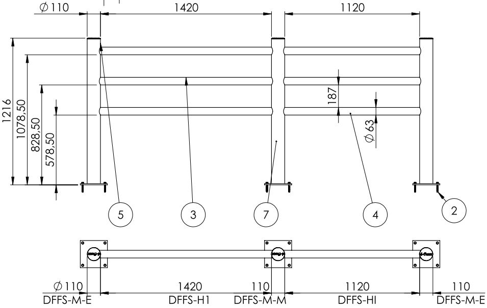Bariera składa się z dwóch słupków Ø 110 mm DFFS-M-E oraz 3 sztuk belek poziomych Ø 63mm DFFS-H1